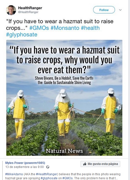La leyenda dice algo así como «Si tienes que llevar un traje de protección para material peligroso para obtener cosechas, ¿por qué deberías comértelas?». Un argumento muy habitual de los anti-pesticidas.
