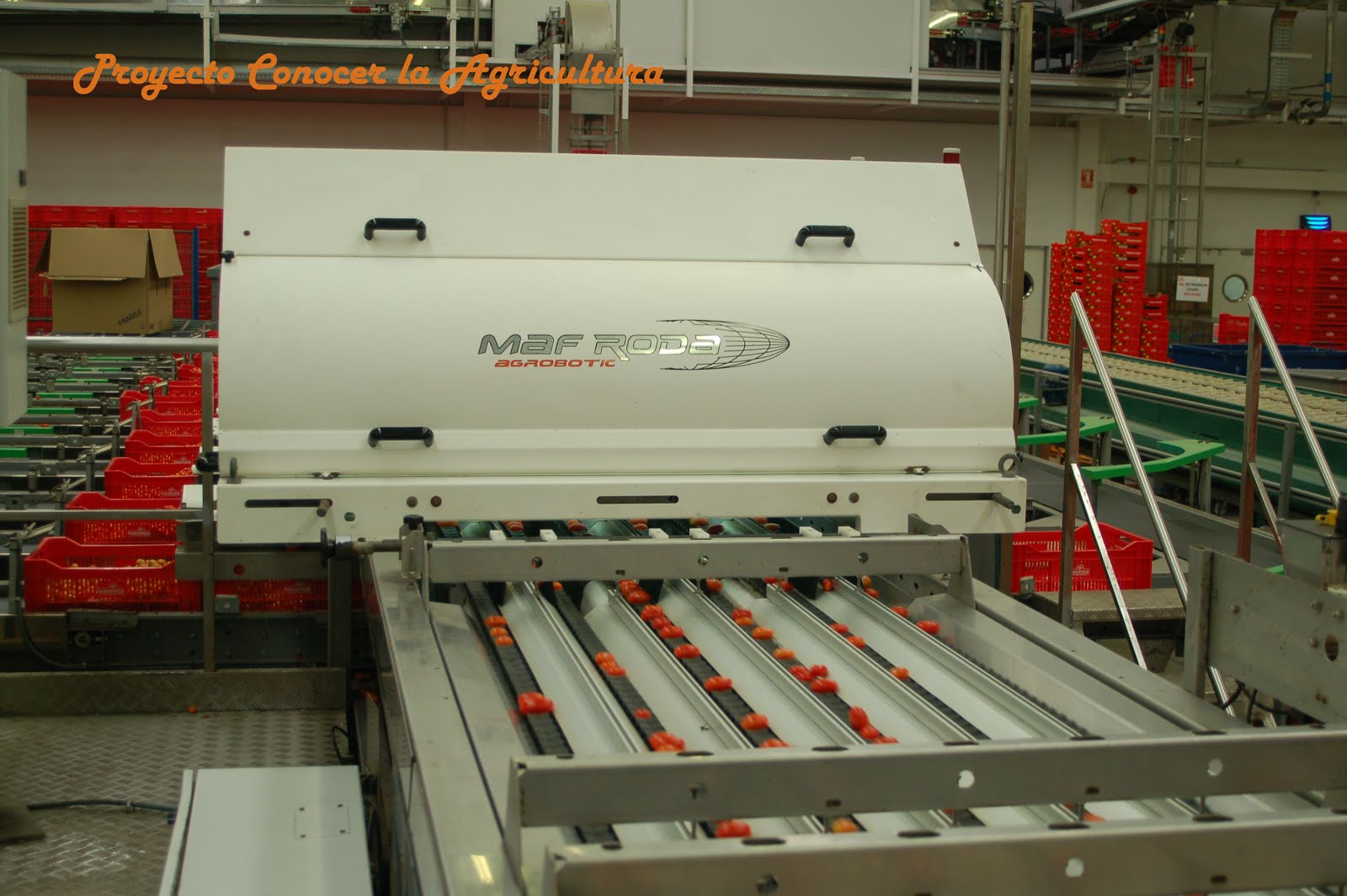 Selección mediante cámara óptica: este cacharro hace nueve fotos de cada tomate, y no van precisamente despacio.