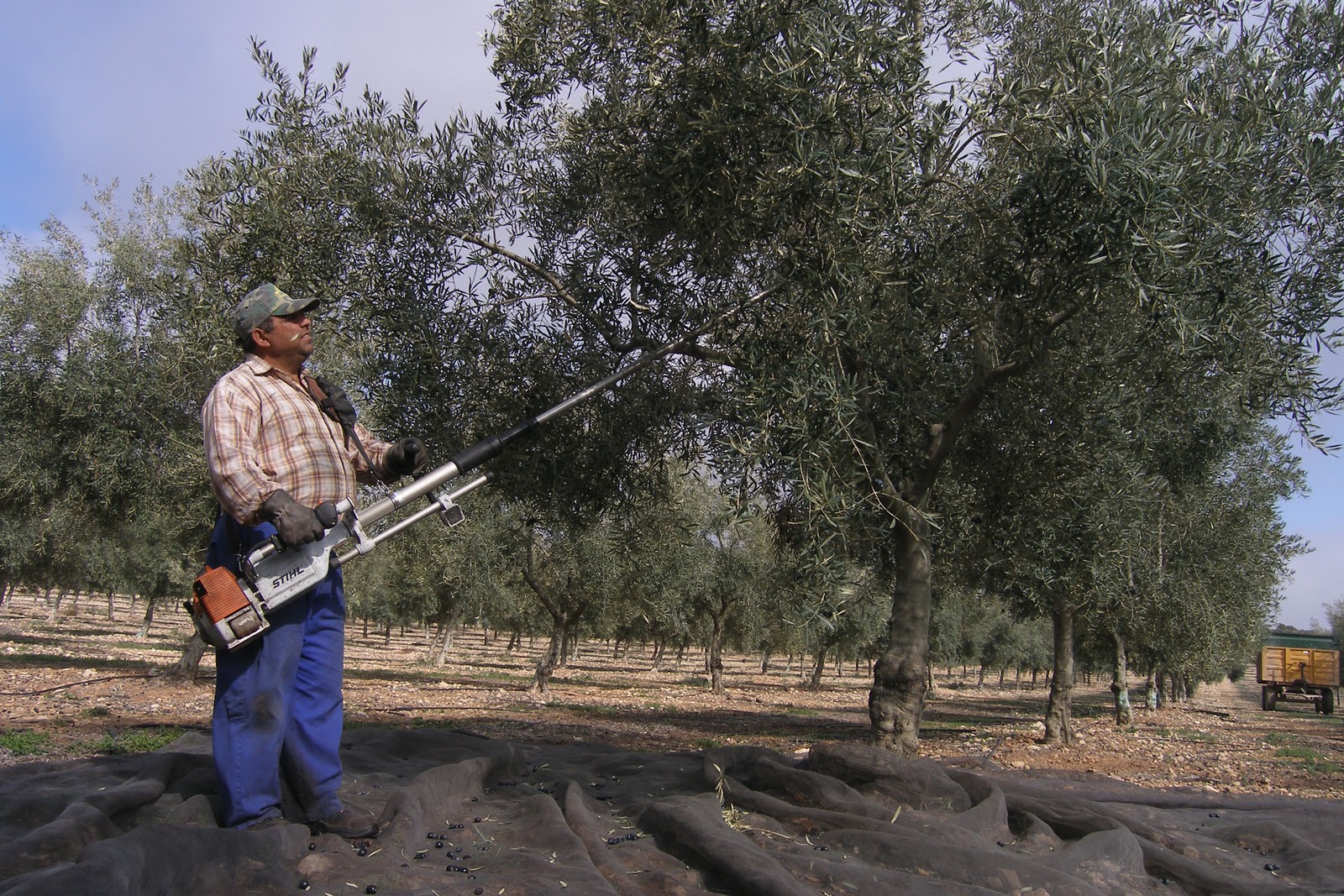El tamaño y la edad de estos árboles no aconseja utilizar máquinas vibradoras, que agarran el tronco y dan «un buen meneo» al árbol para recolectar la aceituna.