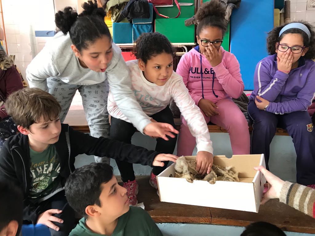 La lana, tal como salió al esquilar la oveja, despertaba curiosidad y asco a partes iguales. A algunos niños les llamaba la atención el olor y a otros el tacto; — ¡es como una pelota anti estrés! — exclamó un niño.