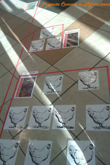 La actividad, “A vueltas con los huevos”, tiene su origen en parte en la controversia que dio lugar una de las entradas del blog. Los huevos son un producto muy consumido y los consumidores apenas hacemos caso a la información sobre el código que llevan impreso, aunque sea totalmente accesible. Para hacer comprender de una manera más visual las diferencias entre los métodos de producción decidimos representar en el suelo el espacio del que disponen las gallinas criadas en jaulas, en suelo, al aire libre y las ecológicas, con su cartelito identificativo, y el precio medio de media docena de huevos para que se viera que cada método de producción conlleva unos costes. Al preparar la actividad y fijarnos en los códigos de los huevos que compramos pudimos descubrir ciertas cosas, que cuanto menos resultan chocantes: huevos amparados bajo la denominación “Galicia calidade” pero procedentes de Francia; o huevos camperos envasados en Madrid y producidos en Portugal. Esto no tiene por qué suponer ningún problema, ya que estos países también han de seguir el Modelo Europeo de Producción, pero si sabemos interpretar el código podremos decidir en consecuencia.
